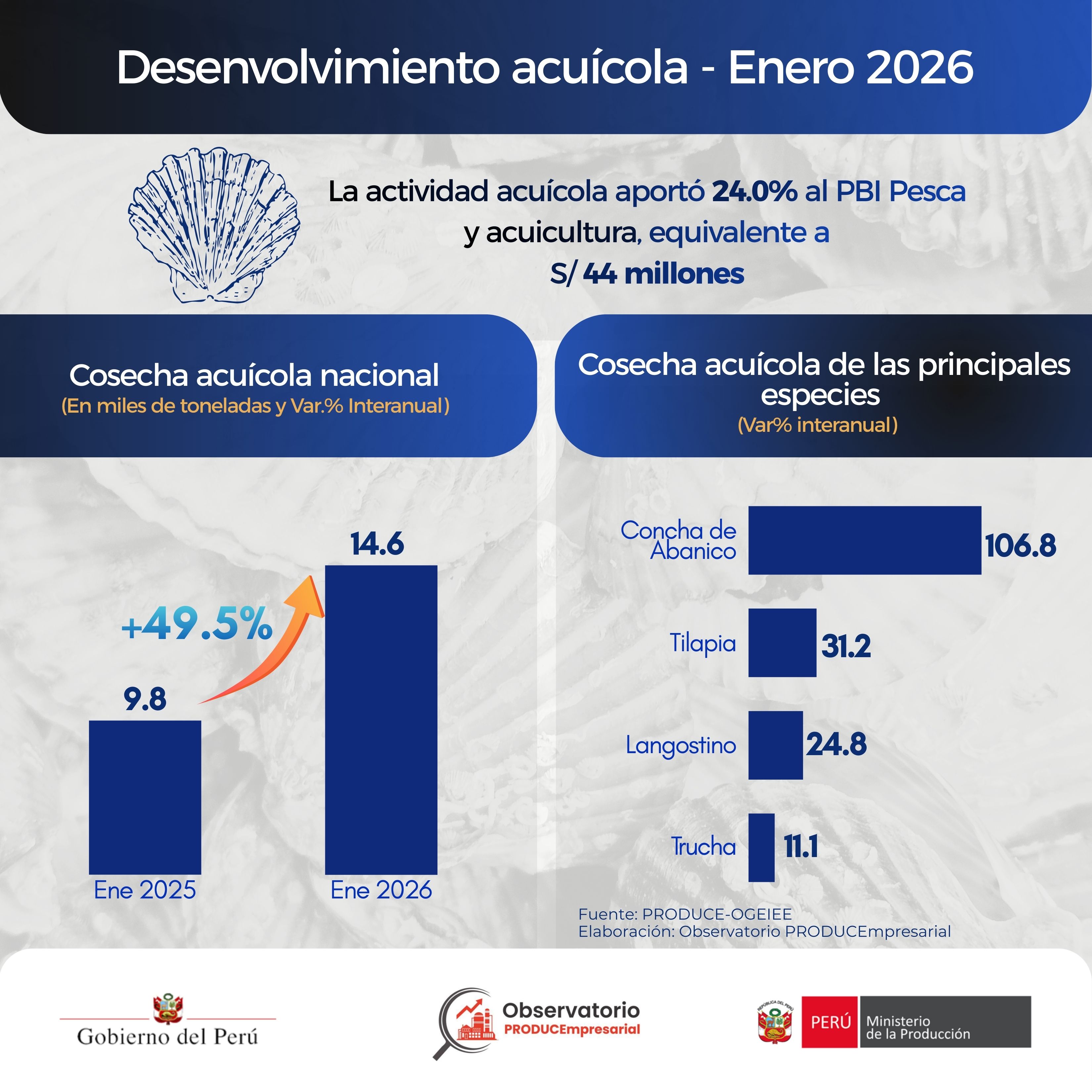 En enero del 2026, la cosecha acuícola creció en 49.5% interanual. Este resultado fue impulsado principalmente por un aumento en la cosecha de concha de abanico (+106.8%), langostino (+24.8%), trucha (+11.1%) y tilapia (+31.2%), favorecido por la mejora en las condiciones climáticas.