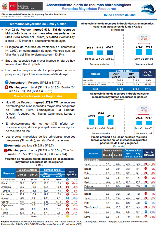 Hoy 02 de Febrero, ingresaron 571.1 TM de recursos hidrobiológicos a los mercados mayoristas de Lima (Villa María del Triunfo) y Callao (Ventanilla); siendo 0.1% inferior al abastecimiento de ayer. Entre las especies con mayor ingreso el día de hoy fueron: Jurel, Bonito y Pota. Asimismo, ingresaron 279.6TM de recursos hidrobiológicos a los mercados mayoristas … Read more