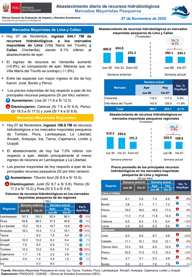 Reporte: Abastecimiento diario de recursos hidrobiológicos. Mercados mayoristas pesqueros 07-11-2025