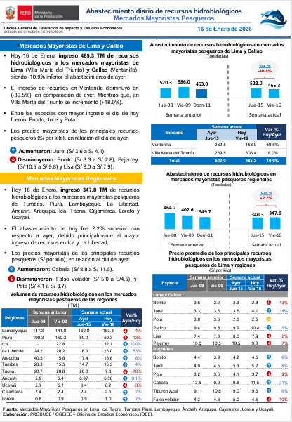 Reporte: Abastecimiento diario de recursos hidrobiológicos. Mercados mayoristas pesqueros 16-01-2025