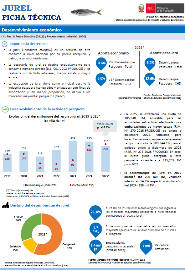 El jurel (Trachurus murphyi) es un recurso de alto consumo a nivel nacional por su precio asequible y debido a su valor nutricional. La extracción de jurel tiene como principal destino la industria pesquera (congelados y enlatados) con fines de exportación y, en menor proporción, se deriva a los