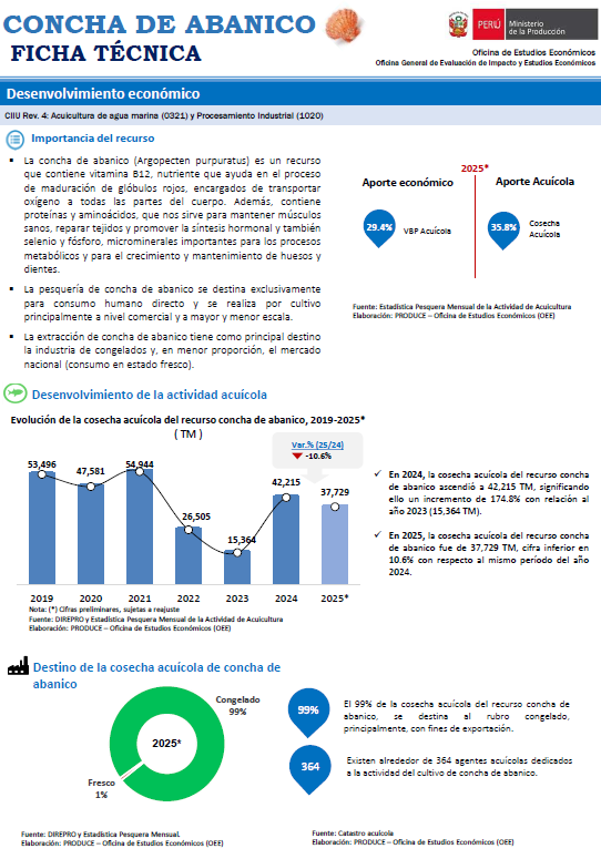 The peruvian scallop (Argopecten purpuratus) is a resource that contains vitamin B12, a nutrient that helps in the maturation process of red blood cells, responsible for transporting oxygen to all parts of the body. It also contains proteins and amino acids, which help us to maintain healthy muscles, repair tissues and promote hormone synthesis, as well as selenium and phosphorus, important microminerals for metabolic processes and for the growth and maintenance of bones and teeth.