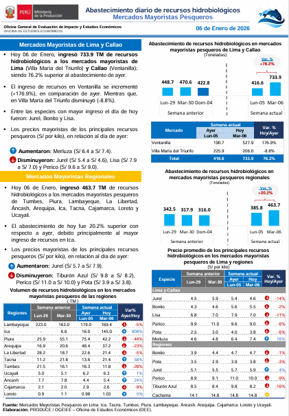Hoy 06 de Enero, ingresaron 733.9 TM de recursos hidrobiológicos a los mercados mayoristas de Lima (Villa María del Triunfo) y Callao (Ventanilla); siendo 76.2% superior al abastecimiento de ayer. Entre las especies con mayor ingreso el día de hoy fueron: Jurel, Bonito y Lisa. Asimismo, ingresaron 463.7 TM de recursos hidrobiológicos a los mercados … Read more