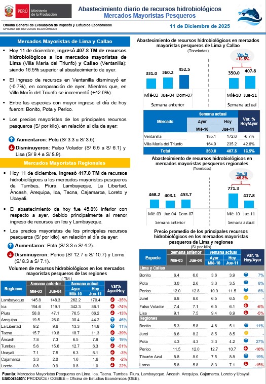 Hoy 12 de diciembre, ingresaron 527.5 TM de recursos hidrobiológicos a los mercados mayoristas de Lima (Villa María del Triunfo) y Callao (Ventanilla); siendo 29.4% superior al abastecimiento de ayer. Entre las especies con mayor ingreso el día de hoy fueron: Bonito, Perico y Merluza. Asimismo, ingresaron 582.0 TM de recursos hidrobiológicos a los mercados … Read more