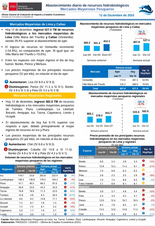 Reporte: Abastecimiento diario de recursos hidrobiológicos. Mercados mayoristas pesqueros 12-12-2025
