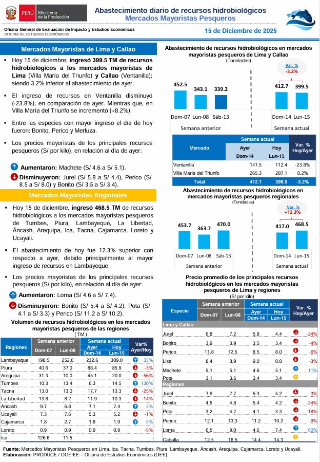 Hoy 15 de diciembre, ingresaron 399.5 TM de recursos hidrobiológicos a los mercados mayoristas de Lima (Villa María del Triunfo) y Callao (Ventanilla); siendo 3.2% inferior al abastecimiento de ayer. Entre las especies con mayor ingreso el día de hoy fueron: Bonito, Perico y Merluza. Asimismo, ingresaron 468.5 TM de recursos hidrobiológicos a los mercados … Read more