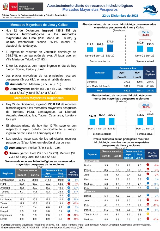 Hoy 22 de Diciembre, ingresaron 435.3 TM de recursos hidrobiológicos a los mercados mayoristas de Lima (Villa María del Triunfo) y Callao (Ventanilla); siendo 25.1% inferior al abastecimiento de ayer. Entre las especies con mayor ingreso el día de hoy fueron: Bonito, Perico y Jurel. Asimismo, ingresaron 530.8 TM de recursos hidrobiológicos a los mercados … Read more