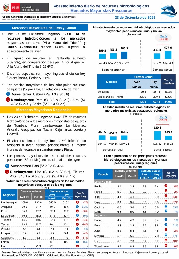 Reporte: Abastecimiento diario de recursos hidrobiológicos. Mercados mayoristas pesqueros 23-12-2025