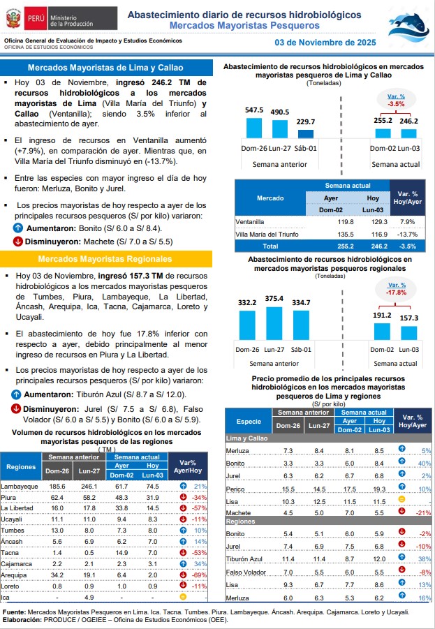 Reporte: Abastecimiento diario de recursos hidrobiológicos. Mercados mayoristas pesqueros 03-11-2025