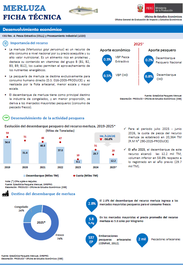 La merluza (Merluccius gayi peruanus) es un recurso de alto consumo a nivel nacional por su precio asequible y su alto valor nutricional Es un alimento rico en proteínas destaca su contenido en vitaminas del grupo B (B1 B2 B3 B9 B12), los cuales permiten el aprovechamiento de