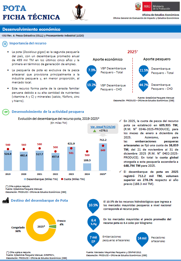 La pota (Dosidicus gigas) es la segunda pesquería del país, con un desembarque promedio anual de 456 mil TM en los últimos cinco años y la