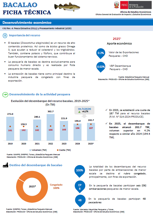 El bacalao (Dissostichus eleginoides) es un recurso de alto contenido proteínico Así como de ácidos grasos Omega 3 que ayudan a reducir el colesterol y los triglicéridos También, contiene potasio y fósforo, que contribuye al buen funcionamiento del sistema nervioso. La extracción de bacalao tiene como principal destino la industria pesquera de congelado con fines de exportación.