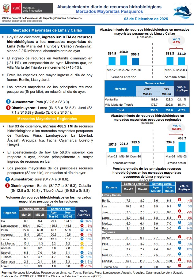 Hoy 03 de diciembre, ingresaron 331.0 TM de recursos hidrobiológicos a los mercados mayoristas de Lima (Villa María del Triunfo) y Callao (Ventanilla); siendo 2.2% inferior al abastecimiento de ayer. Entre las especies con mayor ingreso el día de hoy fueron: Bonito, Lisa y Jurel. Asimismo, ingresaron 468.2 TM de recursos hidrobiológicos a los mercados mayoristas pesqueros de Tumbes, Piura, Lambayeque, La Libertad, Áncash, Arequipa, Ica, Tacna, Cajamarca, Loreto y Ucayali.