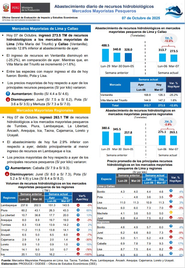 Hoy 07 de Octubre, ingresaron 273.5 TM de recursos hidrobiológicos a los mercados mayoristas de Lima (Villa María del Triunfo) y Callao (Ventanilla); siendo 12.8% inferior al abastecimiento de ayer. Entre las especies con mayor ingreso el día de hoy fueron: Bonito, Pota y Lisa. Asimismo, ingresaron 263.1 TM de recursos hidrobiológicos a los mercados mayoristas pesqueros de Tumbes, Piura, Lambayeque, La Libertad, Áncash, Arequipa, Ica, Tacna, Cajamarca, Loreto y Ucayali.